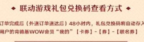 当订单完成后(外送订单送达后)48小时内,礼包兑换码将自动存入用户的肯德基WOW会员;