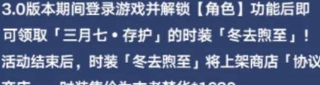 2、玩家在3.0版本期间登录游戏并解锁角色功能后即可领取冬去煦至。