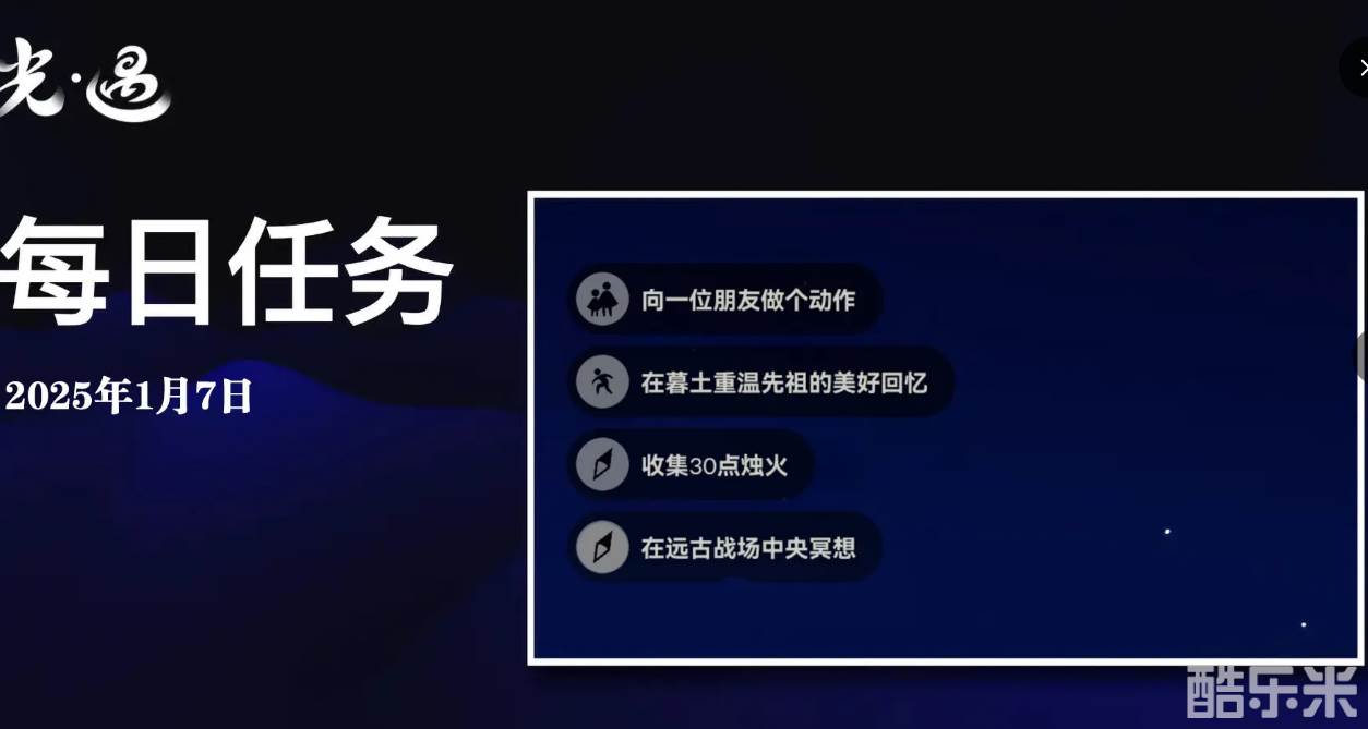 光遇今天的每日任务刷新在了暮土,大家知道今天1月7日的具体任务信息和做法流程吗?下面和酷乐米小编一起来看看吧