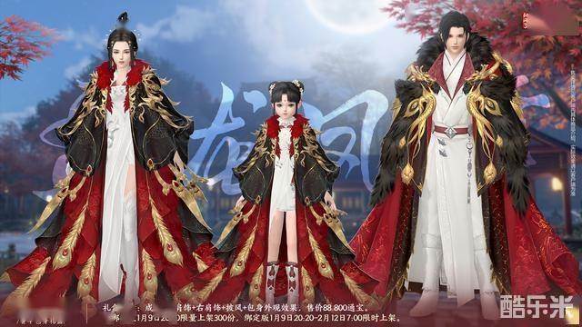 成男款以金银点缀,斜襟设计搭配绒毛披肩,温暖潇洒;成女款上衣贴身轻盈,袖口环绒,胸前垂链与流苏装饰,优雅大方;萝莉款短裙缀以银球,新年增趣,红裙喜庆紫裙典雅,白绒镶玉,吉祥美好。