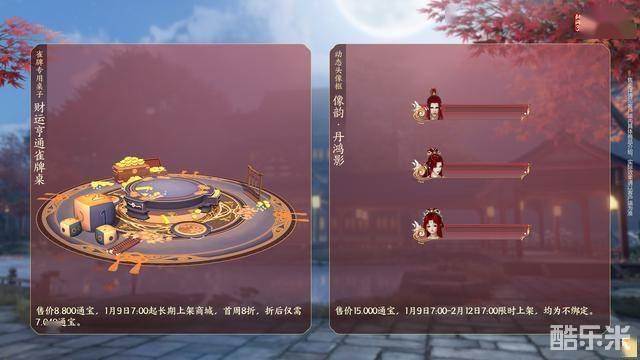 「像韵·丹鸿影」1月9日7:00-2月12日7:00限时上架,均为不绑定,售价15,000通宝。