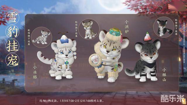 风雪之间,三只幼豹萌动现世,为江湖增添一抹趣味生机!全新“豹抱”系列挂宠各有特色:“小冰酪”活泼机灵,总爱四处撒欢;“小洪炉”慵懒随性,最爱窝着打盹;“小酥山”聪颖狡黠,藏着许多小心机。雪豹幼崽憨态可掬,娇小可爱,既有趣又治愈,陪伴你闯荡江湖,为你的江湖之旅增添无限欢乐与温暖。