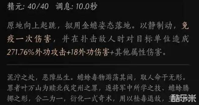 玩家可以模拟金蝉翻身的样子,把附近的敌人全部的打退,而且还可以造成50.96%的外攻击,与此同时还会有其他的属性伤害以及七点外功伤害。
