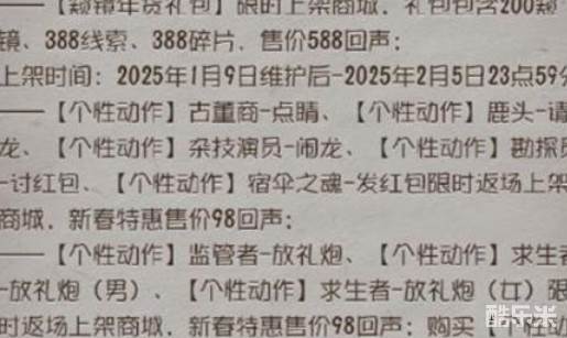 监管者角色的【个性动作】放礼炮将限时返场,增添了节日的喜庆氛围.