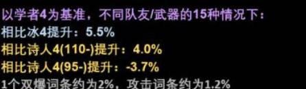 如果不需要速度,那么吃到1层的诗人4比学者4弱4%(2词条),吃满后可以反杀学者4 4%(2词条)。不过大部分人的大黑塔好像还是需要速度。我只能这么说。