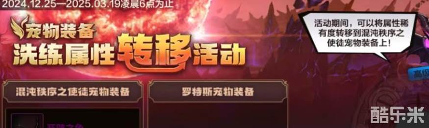 活动有效期内,玩家可以将罗特斯宠物装备的属性转移到混沌秩序之使徒宠物装备上。