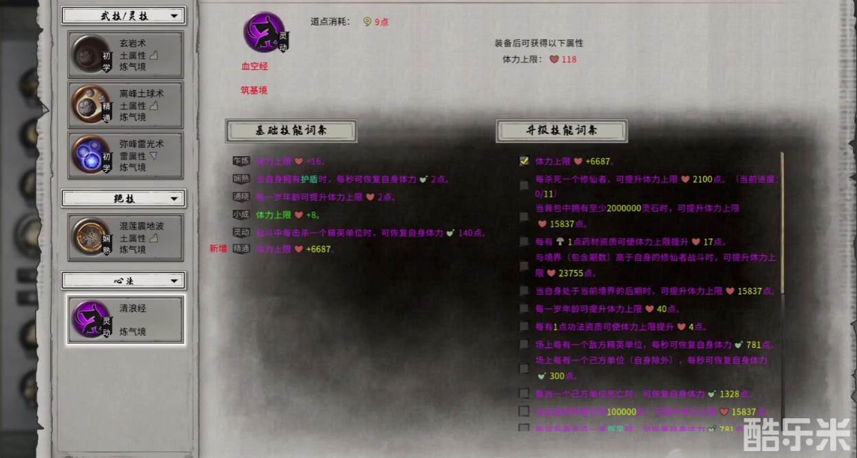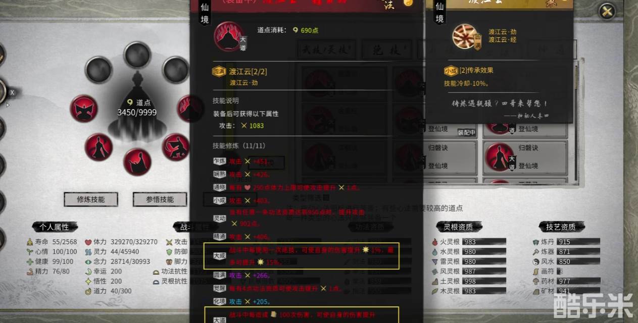 游戏中大部分的红色属性技能,要求玩家的功法资质达到金丹期或元婴期以上,为了满足这一条件,玩家还必须经历九重雷劫,才能够升级自己的功法资质。