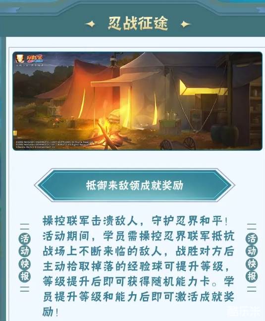 操控联军击溃敌人,守护忍界和平!活动期间,学员需操控忍界联军抵抗战场上不断来临的敌人,战胜对方后主动拾取掉落的经验球可提升等级,等级提升后即可获得随机能力卡。学员提升等级和能力后即可激活成就奖励!