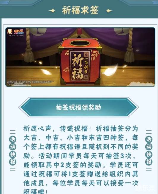 祈愿心声,传递祝福!祈福抽签分为大吉、中吉、小吉和末吉四种签,每个签上都有祝福语且随机到不同的奖励。活动期间学员每天可抽签3次,能领取其中2支签的奖励。学员还可通过祝福可将1支签赠送给组织内其他成员,每位学员每天可以接受一次祝福噢!