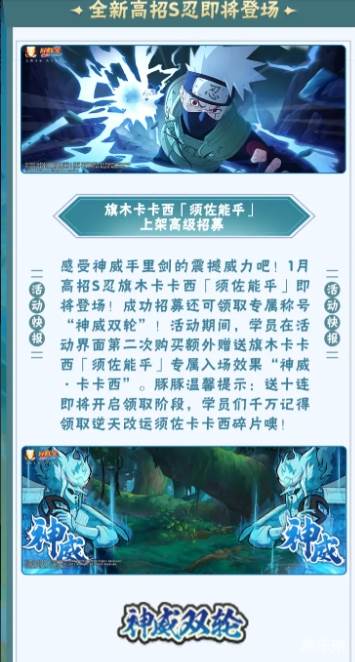 随着须佐卡卡西的上架,玩家在招募后能够获得特殊的对应称号,并且在活动期间能够获得特殊奖励,下面和酷乐米小编一起来看看吧