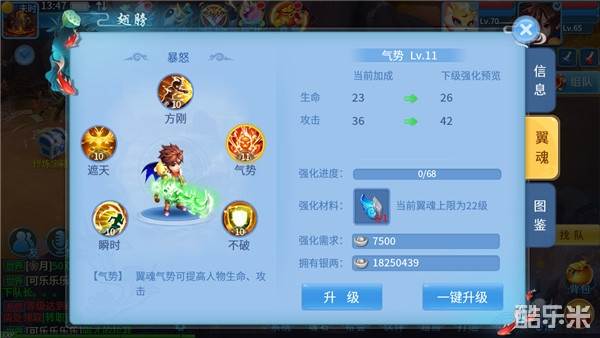 一共有5个翼魂可以升级,如果是物理职业的,就主升气势;如果是法术职业的,就主升遮天。不过法术职业的伤害会把自身的攻击力转化为一定的法术伤害,因此法师们除了主要提升灵力的翼魂外,跟攻击有关的翼魂也可以培养一下