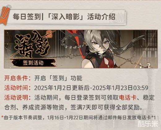 活动说明:活动期间,每日登录签到可领取电话卡、稳定合剂、养成资源等物资,签满7天即可获得全部奖励。由于版本节奏调整,1月16日-1月22日期间将通过邮件每日发放电话卡*1