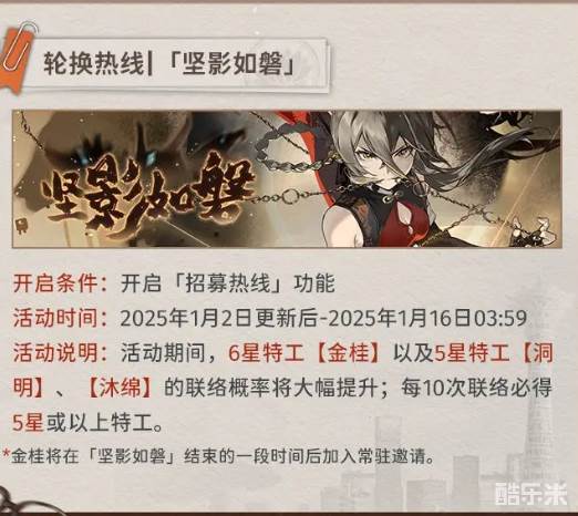 在坚影如磐活动期间6星特工【金桂)特工获取概率得到提升,想要抽取的玩家可以抓紧时间抽取,那么下面和酷乐米小编一起来看看吧