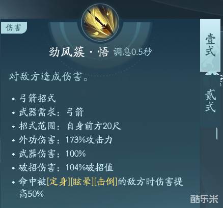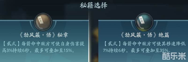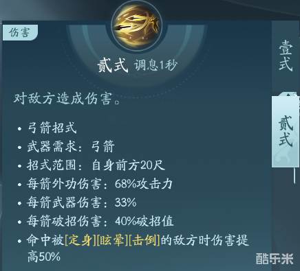射出箭矢普攻,一共有两段技能。PVP可以点绝篇,PVE点秘章增伤