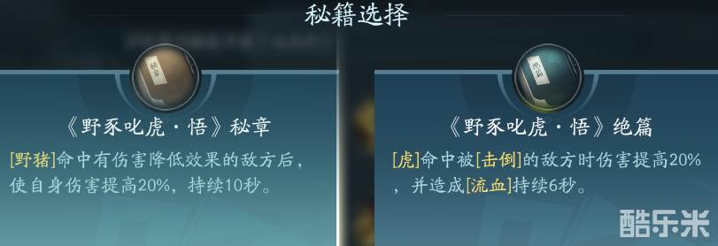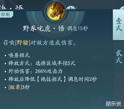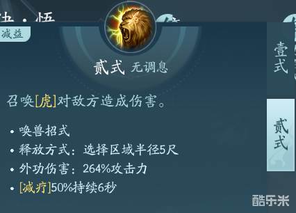 这是一个有两段技能的召唤技能,一段可以召唤一个野猪,二段可以召唤出一只老虎。这两个秘籍都适合PVP携带,在二段减疗后控制或者增伤,PVE要点的话点绝篇。
