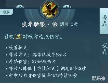 召唤技能,一段召唤一只鹰,二段召唤出一头狼。PVP可以点秘章,PVP点绝篇。