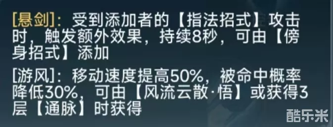 “游风”:给自己上的增益buff,需要通过释放【风云流散】或叠加3层“通脉”获得,(引窍和断脉可叠加“通脉”)。当我们点出奇穴二【风扬】后,指法招式在触发“悬剑”效果时会额外造成1次内功伤害