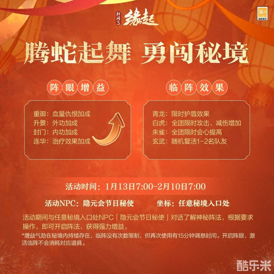 年味渐浓,福满乾坤。值此佳节,《剑网3缘起》喜迎新春,准备了诸多奖励与趣味玩法诚邀各位侠士同贺新岁!不仅有神秘阵法开启带来强力秘境增益,还有全新「弈牌」玩法“王炸”来袭!年味满满,趣味无穷不容错过!