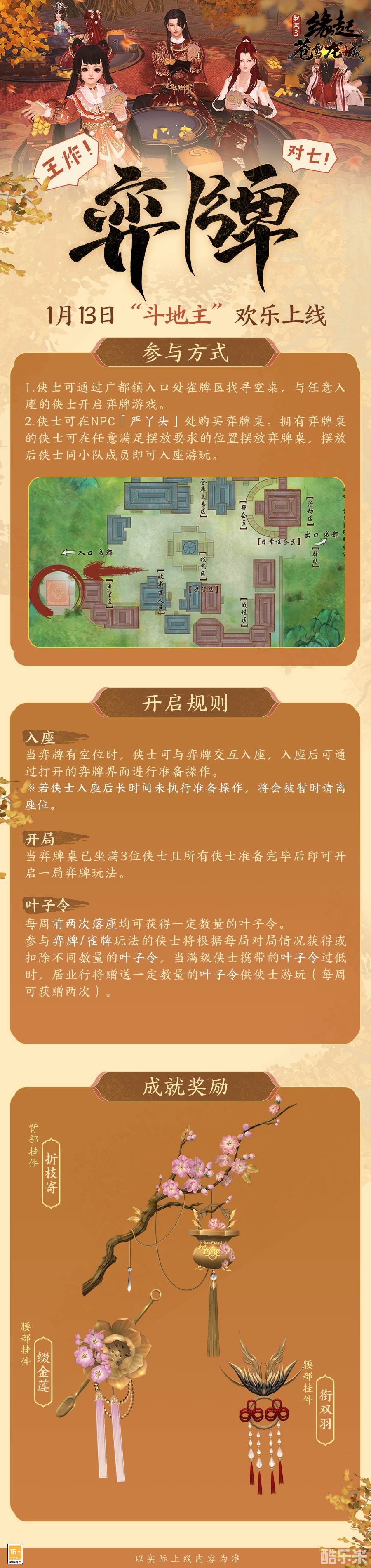 不会打麻将怎么办?《剑网3缘起》全新「弈牌」玩法趣味来袭!该玩法取自经典扑克牌游戏“斗地主”,牌型较少,玩法简单,极易上手!成都摆放了数张奕牌桌供侠士欢乐游玩,前往「严丫头」处购买弈牌桌,还可随时随地与同小队成员入座游玩!此次我们也准备了与「弈牌」相对应的全新成就与成就奖励挂件,祝各位侠士新的一年连对连连福相连,对子成对喜成双!