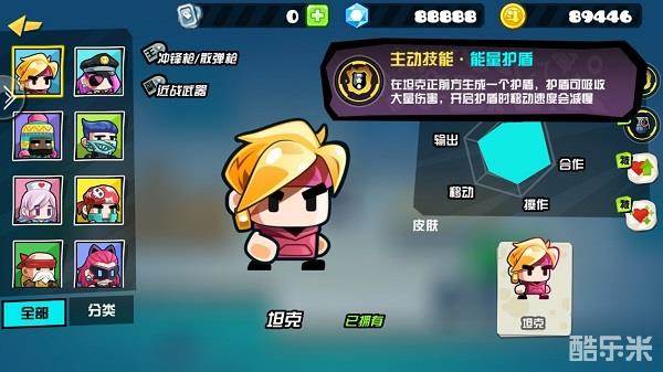 【一技能】能量护盾:在角色正前方生成一个护盾,护盾可吸收大量伤害,开启护盾时移动速度会减慢。