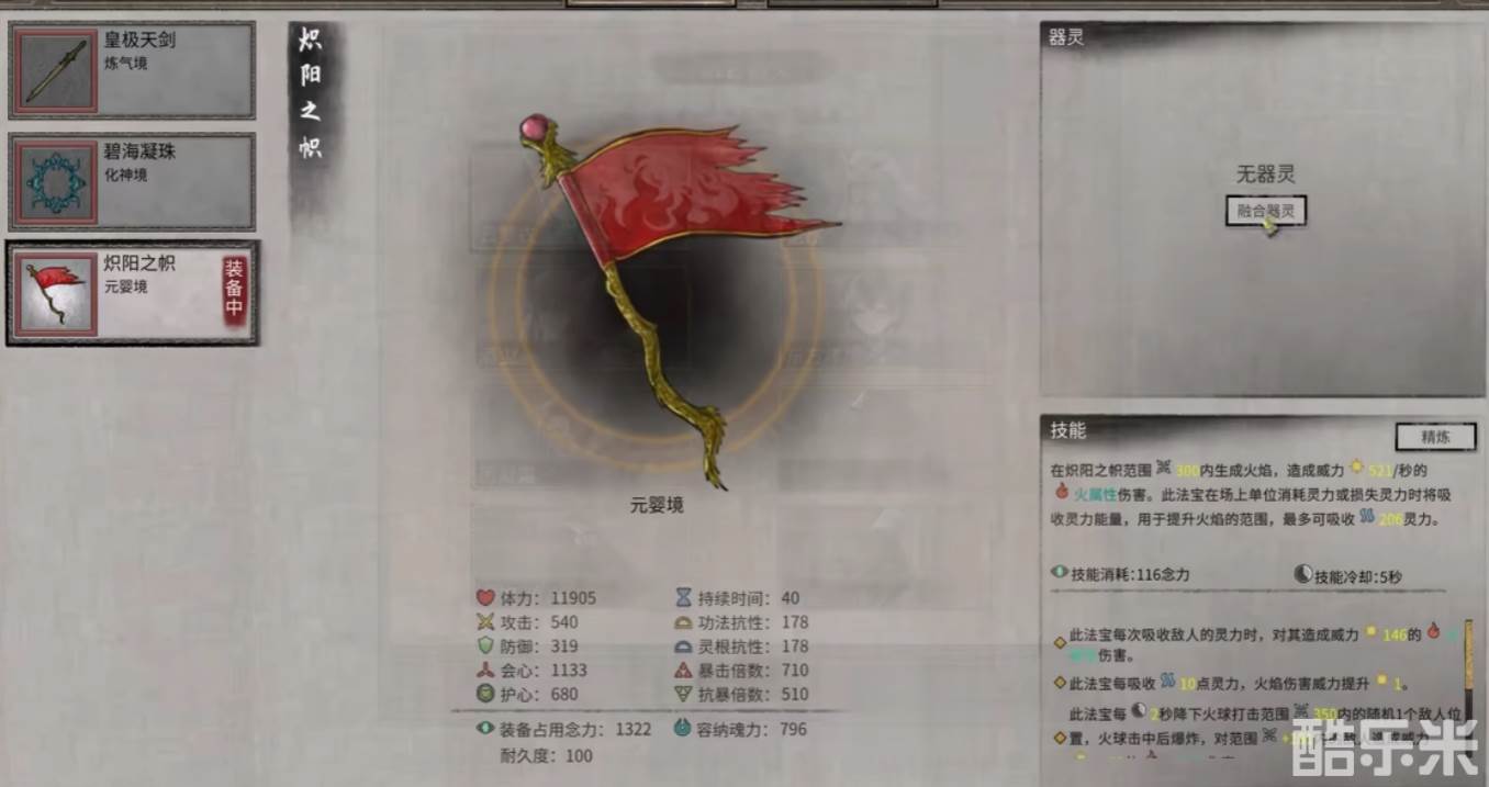 器灵和法宝的搭配流派,在游戏当中实际上只有两种,第一个是输出爆发流派,这个流派比较适用于酒尘和皇极天剑这两个器灵。
