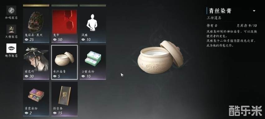 在染色界面,玩家可以看到可染色的服装和发型,此时,可以使用游戏中的染膏进行颜色调整。青丝染膏可以在地华商店、江湖百珍商店和赵飞烟私库购买,适用于基础颜色的调整;凝华染膏则在和鸣商店购买,用于高级颜色的调制。每种染膏都有不同的颜色选择,玩家可以根据自己的喜好进行搭配。