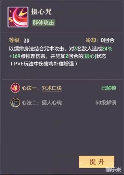 心法2:【摄心】状态下被攻击,有概率使目标进入【恐惧】状态,持续2回合,单回合可触发一次。(恐惧状态下目标无法执行防御以外的操作。)