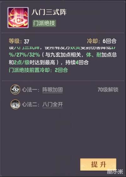 为1只友方妖灵恢复相应血量,并以其为【阵眼】创造八门三式阵,使所有友方妖灵受到伤害大幅降低,持续4回合。【阵眼】受到伤害增加,不享受八门三式阵效果,不能进行防御,不能成为友方行动目标,死亡退场后八门三式阵效果失效。