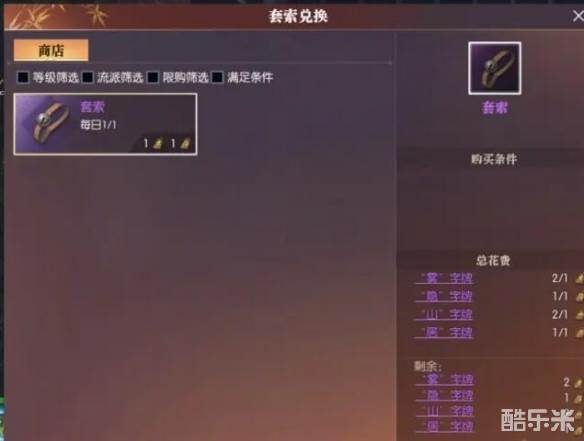2、对话【杨绵绵】领取字牌然后点击牌子【雾、隐、山、居】合成一个套索;