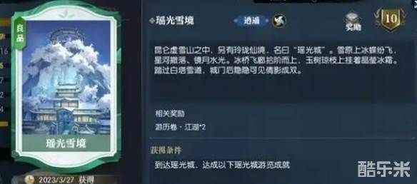 瑶光雪境是瑶光城区域的卡片,很多玩家想知道说英雄卡瑶光雪境怎么做,首先前往【瑶光城】去以下的地方使用对应动作,完成以上的成就后即可获得对应的说英雄卡【瑶光雪境】,下面和酷乐米小编一起来看看吧