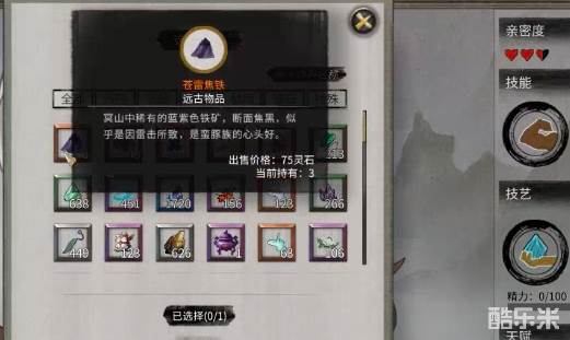 其实在游戏当中这个角色比较喜欢的礼物是苍雷焦铁,这个物品可以前往云陌洲的陨幽谷通过打副本完成快速的获取,获取难度并不是很高,而且通过该礼物的赠送,亲密度可以快速增加,目前这个角色达到五颗星或者是十颗星的时候就可以相继赠送礼物了。