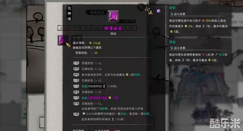 目前比较推荐的是神雷秘卷这个画神经的密卷可以让玩家获得更高的属性,因为在学习完这个紫色雷剑后,不仅可以使灵根抗性快速增加,而且每次使用身法时则可以实现叠加一层斩剑,尤其是对于进修的玩家会有着非常好的效果,展现的战斗效果是每一层可使自身对体力低于50%的敌人造成伤害,提升2%,并且可持续七秒之长,最多可叠加六层。并且学习完神雷密卷后,玩家还可以将流血的持续时间增加3.09秒流血这个战斗效果每层和使效果携带者受到剑法伤害且持续时间长达七秒,最多可叠加六层。