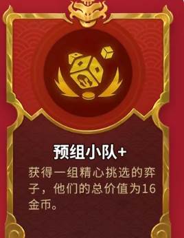 1、预组小队+:获得一组精心挑选的弈子,他们的总价值为16金币。