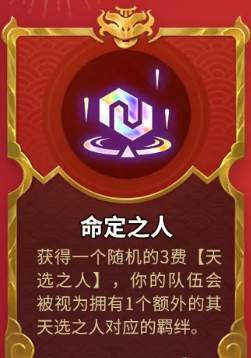 1、命定之人:获得一个随机的3费[天选之人],你的队伍会被视为拥有1个额外的其天选之人对应的羁绊。