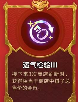 2、运气检验III:接下来3次商店刷新时,获得相当于商店中棋子总售价的金币。