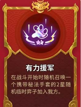 3、有力援军:在战斗开始时随机召唤一个携带秘法手套的2星随机临时弈子加入我方。