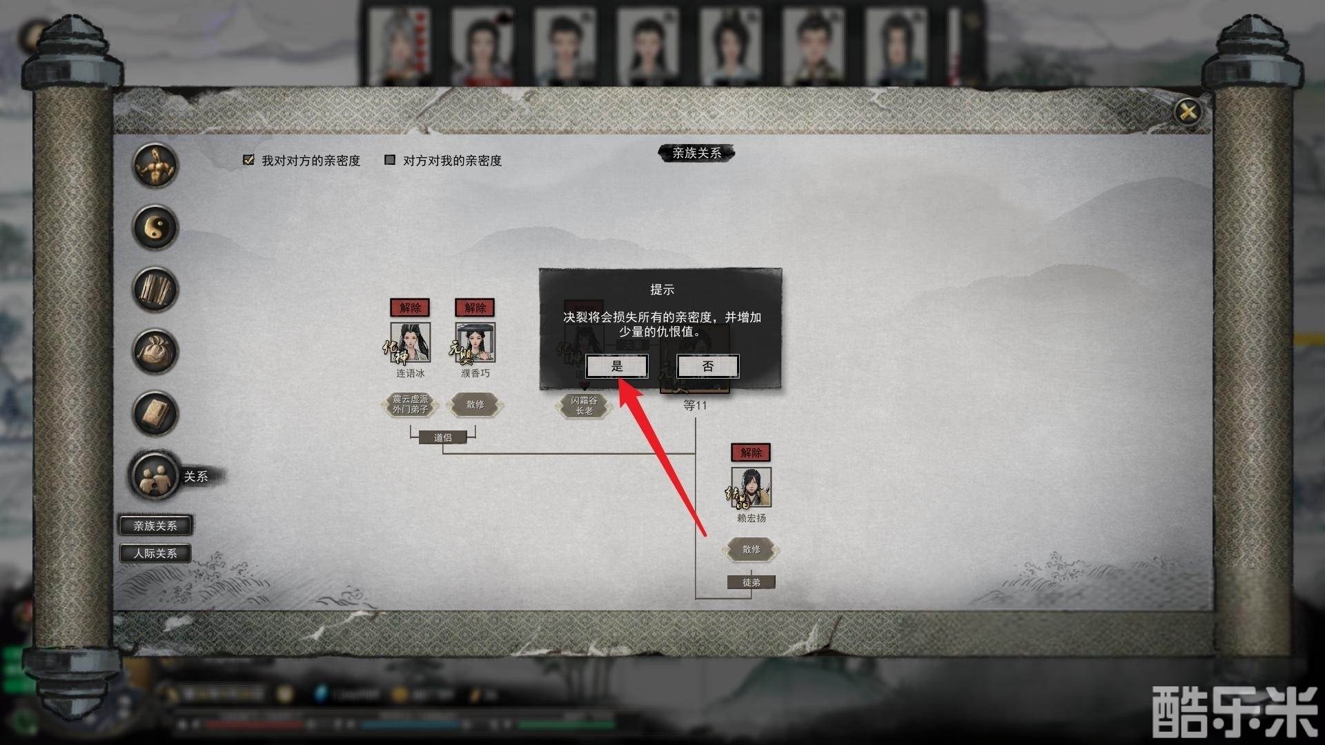 点击关系图标后,玩家将进入亲族关系界面。在这个界面中,玩家可以清晰地看到与每个NPC的具体关系状态。如果角色当前已经与某一位NPC结为道侣,那么该道侣会在界面中有明确的标识。此时,只需点击对应的道侣头像,便会出现一个选项,允许玩家选择解除道侣关系。需要特别注意的是,解除道侣关系是一个不可逆的行为,一旦确认操作,这段修仙旅程中的情缘将宣告终结,NPC的好感度也会因此下降。