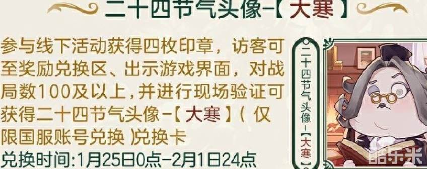 参与现场活动,各位访客有机会获得二十四节气头像-【大寒】兑换卡、线下限量徽章【大寒】、线下活动限定明信片、第五人格周边等丰富奖励~