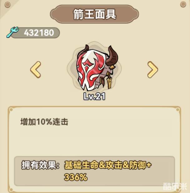 箭王面具能够增加10%连击,提升弓箭手总体连击输出能力,帮助在冒险路上如鱼得水。
