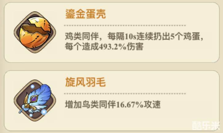 基于同伴选择,遗物推荐鎏金蛋壳或旋风羽毛,前者增加鸡类同伴额外伤害,使其每隔10秒能扔出5个鸡蛋并造成高额伤害。后者可以增加鸟类同伴攻速,在冒险对战时为弓箭手打出更多伤害。