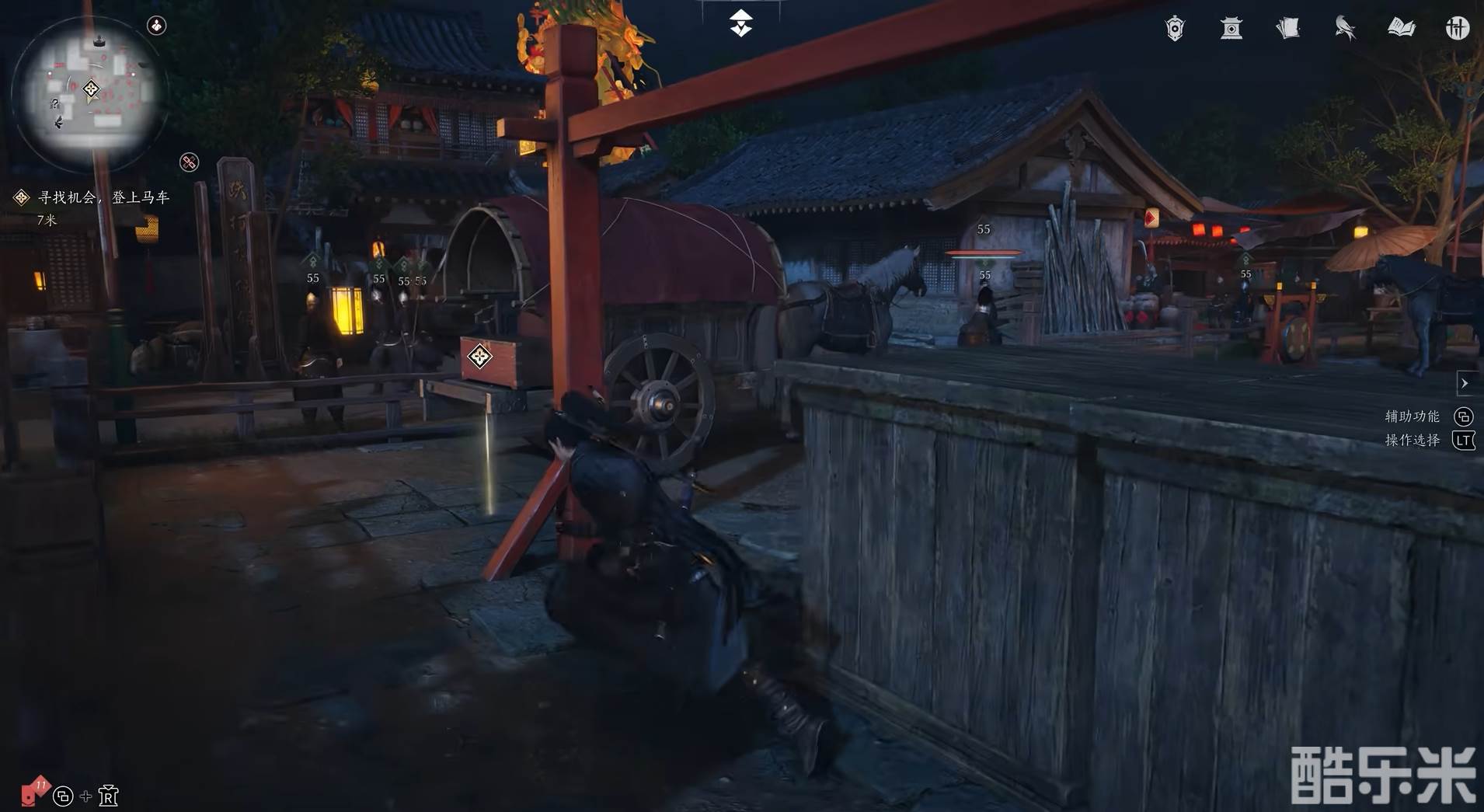 当玩家发现货运马车的位置后,会发现敌人已经将马车周围保护得严严实实,很难从地面用常规方法来接近货运马车,更别提潜入进去了。因此,最好的办法就是通过周围的屋顶,从空中利用跳跃和轻功来完成潜入。
