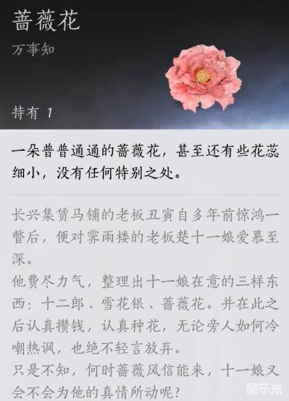 蔷薇风信是东郊最后一个任务,那么蔷薇风信任务怎么做呢,传到【长兴集】对话【丑寅】,进院子里采【蔷薇花】,回到【长兴集】去酒楼二楼,对话【楚11娘】,把蔷薇花给她完成任务,下面和酷乐米小编一起来看看吧
