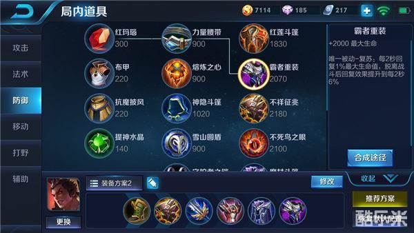 解析:影忍之足提升了吕布的吸收伤害能力有效应对敌方射手的风筝打法;做出不祥征兆可以进一步提升吕布的生存能力并削减敌方英雄的输出能力。在拥有一定的物理抗性后,我们做出破军和反伤刺甲来提升吕布的伤害能力,尤其吕布在附魔后可以打出真实伤害高额的物理加成使得吕布伤害更为爆炸。在做出魔女斗篷后可以抵抗敌方的法师英雄,从而对敌方英雄造成更有效的压制效果。最后做出霸者重装进一步提升吕布的吸收伤害与回复能力。