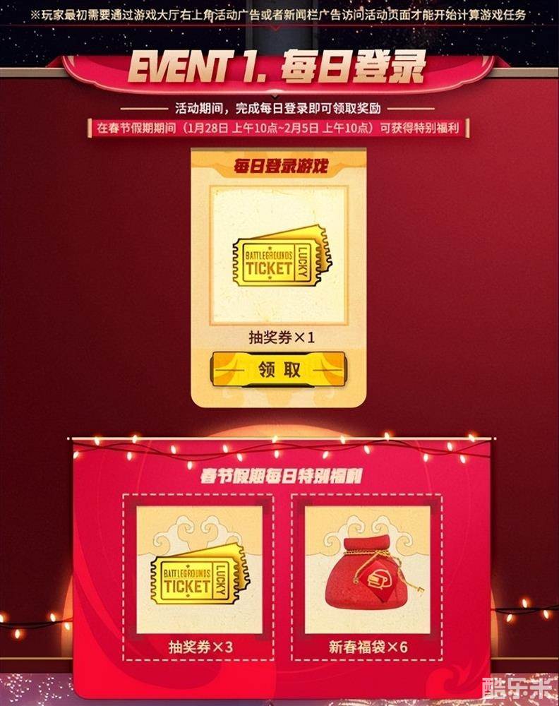 活动1:每日登录:活动期间,玩家每天登录游戏即可领取抽奖券,春节(1月28日10:00-2月5日10:00)期间登录还可额外获得新春福袋;