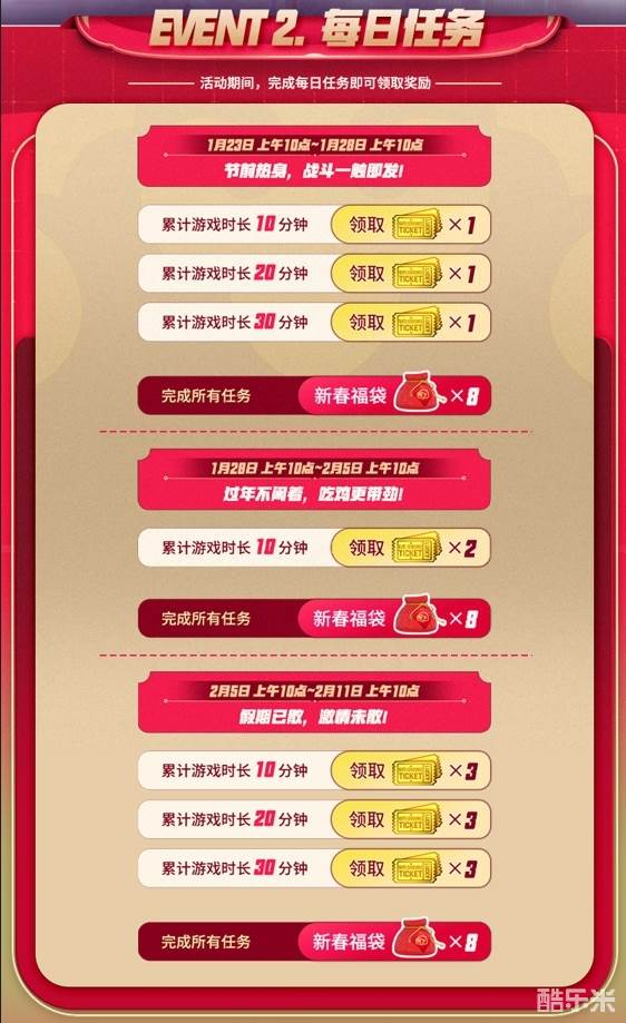 活动2:每日任务:完成每日设定的游戏时长任务,获得抽奖券的同时,还可获得新春福袋;