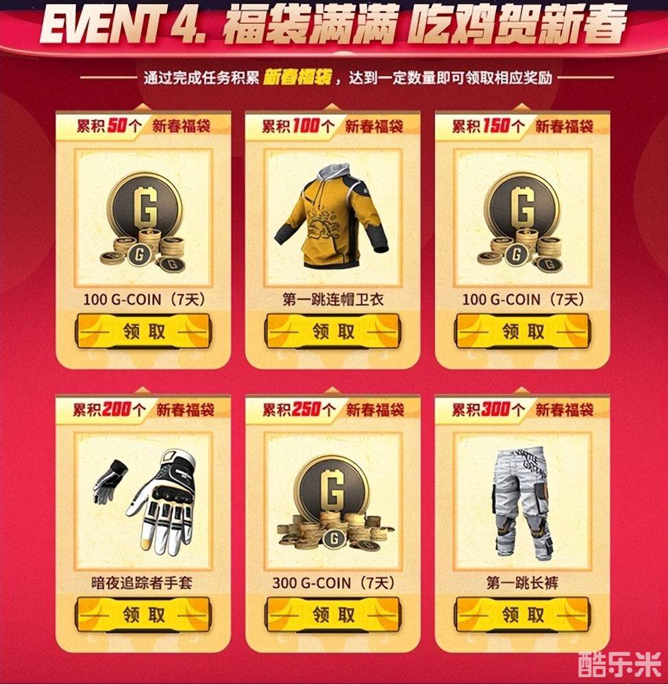活动4:福袋满满 吃鸡贺新春:积累新春福袋,可兑换多款珍稀道具和皮肤。首次上线的连帽卫衣,长裤和暗夜追踪者手套让你的角色焕然一新,迎接新春的到来。