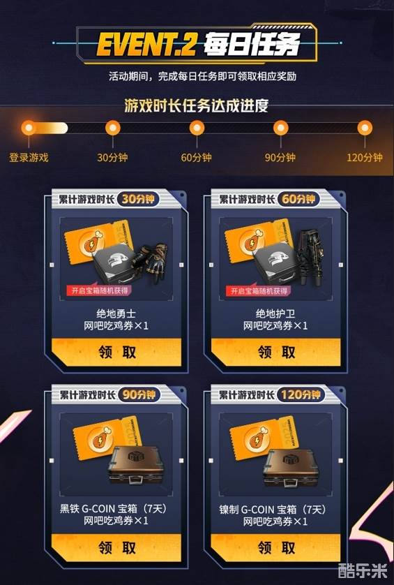 活动2:每日任务:完成每日设定的游戏时长任务,即可获得网吧吃鸡券及游戏宝箱,宝箱中有可能开出游戏道具!