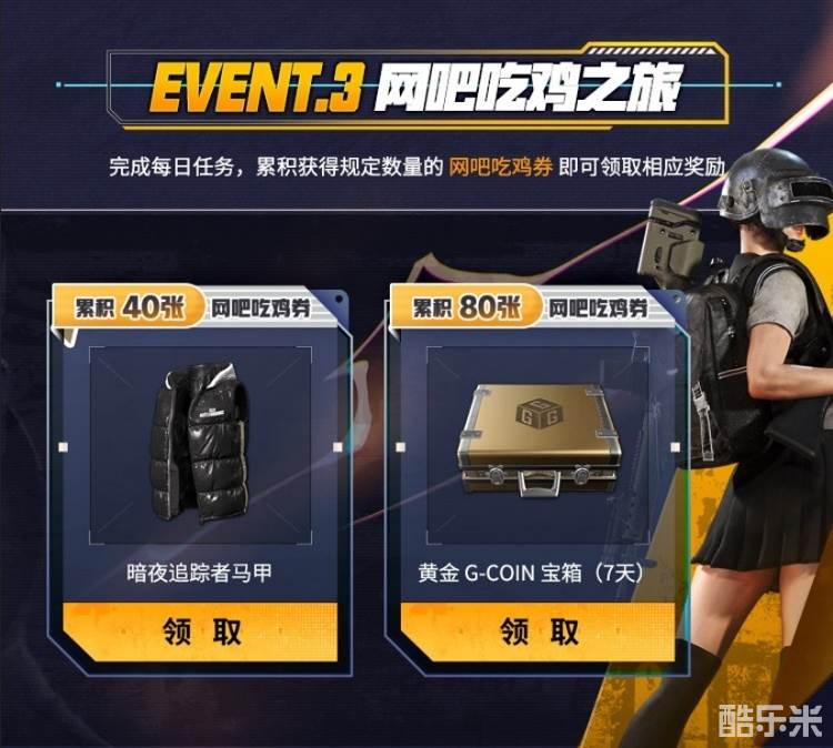 活动3:网吧吃鸡之旅:积累网吧吃鸡券,可兑换新上线皮肤暗夜追踪者马甲及黄金宝箱。