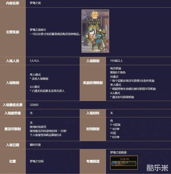挑战特殊地下城可以获得启示礼盒,那么新版本的特殊地下城有哪些呢,目前追加了终末崇拜者、梦境之塔、患妖五怪注视地下城3个,其中终末崇拜者只需112级就能挑战,接下来酷乐米小编给大家带来了详细的《地下城与勇士:起源》梦境之塔副本攻略!