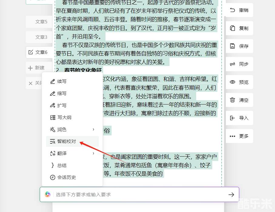 当文章撰写完毕后,为确保其质量,可再次选中全文,点击 “AI 帮我改” 里的 “智能校对” 功能,它能够精准地检查出文章中的错别字以及违规词,为文章的准确性和规范性保驾护航。